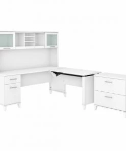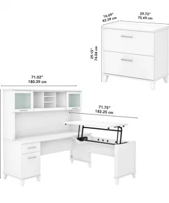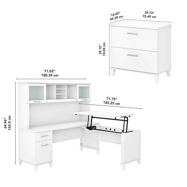 The Bush Furniture Somerset 72W 3 Position Sit to Stand L Shaped Desk with Hutch and Lateral File Cabinet offers an ideal solution for those seeking a stylish and functional ergonomic workspace. As a quality alternative to desktop risers, the innovative 42W x 24D Sit to Stand Return offers all the health benefits of a standing desk with the versatility of more expensive electric height adjustable options. The mechanical Lift-n-Lock system allows the desktop to lock into place at standing heights of 35, 38, and 41 inches and easily returns to a seated position. The 72W x 24D Office Desk includes its own storage with a file drawer and a box drawer for documents and supplies you want to keep close by. Both surfaces have wire management grommets to keep cords in order. The Hutch attaches to the desktop and adds frosted glass doors for concealed storage in addition to open cubby spaces with two shelves. The 2 drawer filing cabinet accepts legal and letter size files and opens on smooth full-extension ball bearing slides. Available in your choice of several attractive finishes with contemporary metal hardware and tapered leg accents, the adjustable corner desk has an appealing look that works with virtually any decor. Fixed surfaces are tested to meet ANSI/SOHO standards for safety and performance while the mechanical lift system is rigorously tested to Bush Furniture's own quality standards.