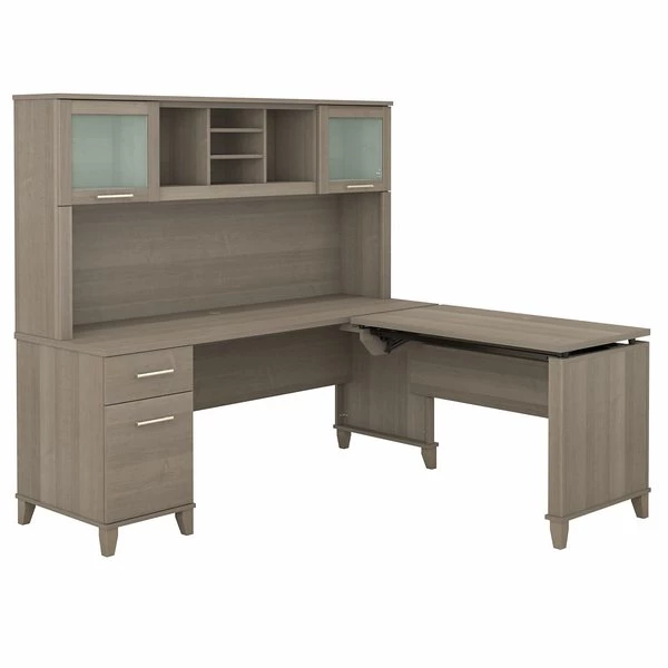 The Bush Furniture Somerset 72W 3 Position Sit to Stand L Shaped Desk with Hutch offers an ideal solution for those seeking a stylish and functional ergonomic workspace. As a quality alternative to desktop risers, the innovative 42W x 24D Sit to Stand Return offers all the health benefits of a standing desk with the versatility of more expensive electric height adjustable options. The built-in mechanical Lift-n-Lock system allows the desktop to lock into place at standing heights of 35, 38, and 41 inches and easily returns to a seated position. The 72W x 24D Office Desk includes a file drawer that opens on full-extension ball bearing slides for easy access to legal and letter size documents in addition to a box drawer for supplies and utensils. Wire management grommets are included on both surfaces to keep cords and cables in order. The Hutch attaches to the desktop and adds frosted glass doors for concealed storage in addition to open cubby spaces with two shelves to hold books, binders, decorations and more. Available in your choice of several attractive finishes with contemporary metal hardware and tapered leg accents, the height adjustable corner desk has an appealing look that works with virtually any decor. Fixed surfaces are tested to meet ANSI/SOHO standards for safety and performance while the mechanical lift system is rigorously tested to Bush Furniture's own quality standards.