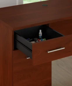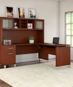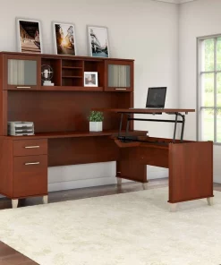 The Bush Furniture Somerset 72W 3 Position Sit to Stand L Shaped Desk with Hutch offers an ideal solution for those seeking a stylish and functional ergonomic workspace. As a quality alternative to desktop risers, the innovative 42W x 24D Sit to Stand Return offers all the health benefits of a standing desk with the versatility of more expensive electric height adjustable options. The built-in mechanical Lift-n-Lock system allows the desktop to lock into place at standing heights of 35, 38, and 41 inches and easily returns to a seated position. The 72W x 24D Office Desk includes a file drawer that opens on full-extension ball bearing slides for easy access to legal and letter size documents in addition to a box drawer for supplies and utensils. Wire management grommets are included on both surfaces to keep cords and cables in order. The Hutch attaches to the desktop and adds frosted glass doors for concealed storage in addition to open cubby spaces with two shelves to hold books, binders, decorations and more. Available in your choice of several attractive finishes with contemporary metal hardware and tapered leg accents, the height adjustable corner desk has an appealing look that works with virtually any decor. Fixed surfaces are tested to meet ANSI/SOHO standards for safety and performance while the mechanical lift system is rigorously tested to Bush Furniture's own quality standards.