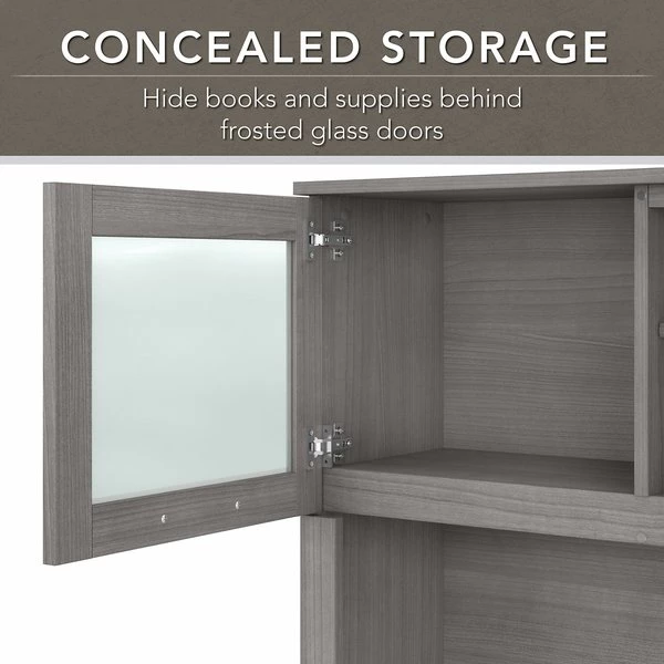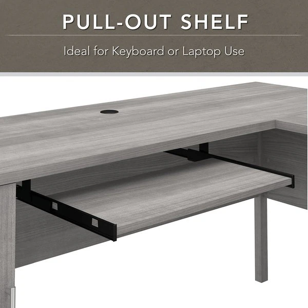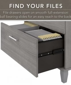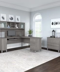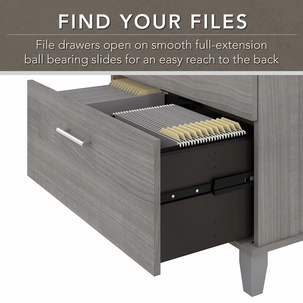 Build your ideal home office around the stylish and functional Bush Furniture Somerset 72W L Shaped Desk with Hutch and Lateral File Cabinet. This spacious office set features all the storage and versatility needed to create a practical, modern workstation. The expansive 72W surface with wire management offers ample room to spread out and complete large projects. A convenient pull-out shelf provides a perfect place to keep a keyboard or laptop, while a vertical storage cabinet with an adjustable shelf and a box drawer offer plenty of storage for office supplies and utensils and a file drawer accommodates letter-size documents. The Hutch has large open compartments for books, binders or decorations and two frosted glass doors for concealed storage. The Lateral File Cabinet utilizes smooth ball bearing slides for easy access to legal and letter size files, even those all the way in the back. Drawers are designed to open one at a time for maximum stability, making the filing cabinet a safe and family-friendly storage solution. Transitional styling includes your choice of several attractive finishes with tapered leg accents and contemporary metal hardware for an alluring appearance. This home office furniture set is tested to meet ANSI/SOHO quality standards for safety and performance.