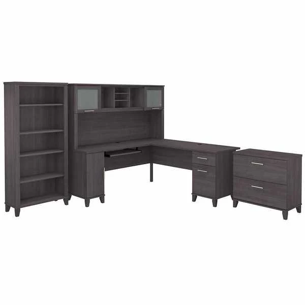 Create a functional and attractive workspace for your home or small office with the Bush Furniture Somerset 72W L Shaped Desk with Hutch, Lateral File Cabinet and Bookcase. This comprehensive furniture set offers plenty of storage space and an expansive 72W surface with wire management that allows for ample room to spread out and complete large projects. A pull-out shelf provides a perfect place to keep a keyboard or laptop while a vertical cabinet with an adjustable shelf, a box drawer, and a file drawer offer storage for office supplies, utensils and documents. The Hutch has large open compartments for books, binders or decorations and two frosted glass doors for concealed storage. The 2 Drawer File Cabinet has smooth full-extension ball bearing slides for easy access to legal, letter and A4-size paperwork and drawers that open one at a time for maximum stability. The 5 Shelf Bookcase matches the height of the Desk with Hutch office set and features two fixed shelves three that are adjustable to ensure items of all sizes have their place. Transitional styling includes your choice of several attractive finishes with tapered leg accents and contemporary metal hardware for an alluring appearance. This home office furniture set is tested to meet ANSI/SOHO quality standards for safety and performance.