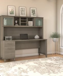 A spacious work surface and plenty of storage capacity make the Bush Furniture Somerset 72W Office Desk with Drawers and Hutch a perfect choice for your home office. Spread out with a computer and paperwork while multitasking on an expansive desktop that includes a built-in wire management grommet to keep cords and cables in order. The Desk's file drawer opens on smooth full-extension ball bearing slides for easy access to legal and letter size documents while a box drawer keeps the office supplies and utensils you need close by. Drawers can be mounted to either side of the desk for a custom configuration. The Hutch attaches to the desktop and adds a pair of frosted glass doors for concealed storage in addition to open cubby spaces with two shelves for books, decorations and more. Somerset's transitional styling includes your choice of several attractive finishes with tapered legs and contemporary metal hardware for an appealing look that works with virtually any decor. The 72W x 24D computer desk can also be used with the coordinating Somerset 42W 3 Position Sit to Stand Return (sold separately) to create an ergonomic height adjustable workspace. This home Office Desk with Storage set is tested to meet ANSI/SOHO quality standards for safety and performance. See the full collection of Somerset home furnishings to expand your workspace.