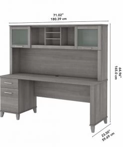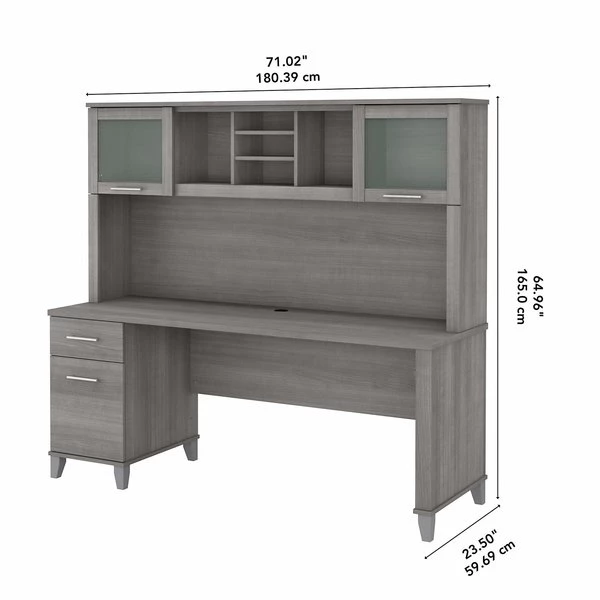 A spacious work surface and plenty of storage capacity make the Bush Furniture Somerset 72W Office Desk with Drawers and Hutch a perfect choice for your home office. Spread out with a computer and paperwork while multitasking on an expansive desktop that includes a built-in wire management grommet to keep cords and cables in order. The Desk's file drawer opens on smooth full-extension ball bearing slides for easy access to legal and letter size documents while a box drawer keeps the office supplies and utensils you need close by. Drawers can be mounted to either side of the desk for a custom configuration. The Hutch attaches to the desktop and adds a pair of frosted glass doors for concealed storage in addition to open cubby spaces with two shelves for books, decorations and more. Somerset's transitional styling includes your choice of several attractive finishes with tapered legs and contemporary metal hardware for an appealing look that works with virtually any decor. The 72W x 24D computer desk can also be used with the coordinating Somerset 42W 3 Position Sit to Stand Return (sold separately) to create an ergonomic height adjustable workspace. This home Office Desk with Storage set is tested to meet ANSI/SOHO quality standards for safety and performance. See the full collection of Somerset home furnishings to expand your workspace.