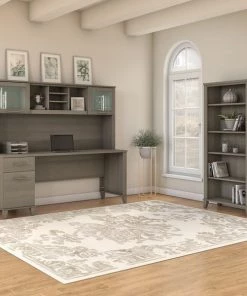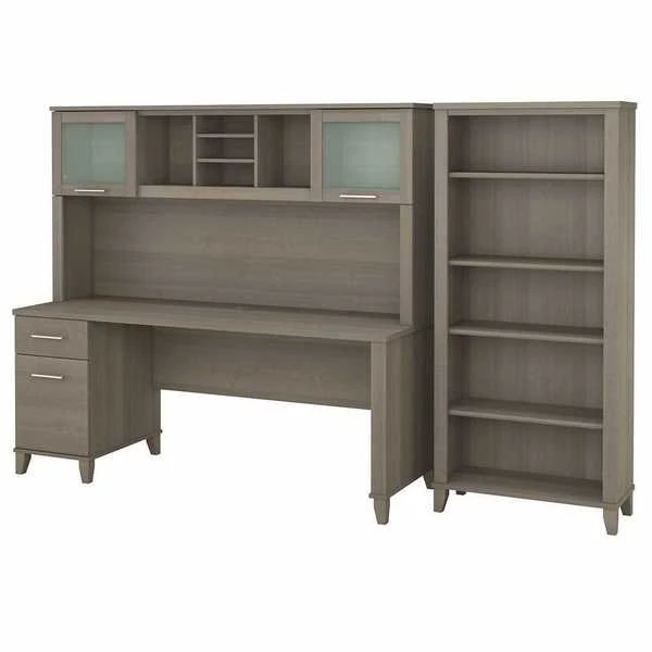 A spacious work surface and plenty of storage capacity make the Bush Furniture Somerset 72W Office Desk with Hutch and 5 Shelf Bookcase a perfect choice for your home office. Spread out with a computer and paperwork while multitasking on an expansive desktop that includes a built-in wire management grommet to keep cords and cables in order. The desk's file drawer opens on full-extension ball bearing slides for easy access to legal and letter size documents while a box drawer keeps the office supplies and utensils you need close by. The Hutch attaches to the desktop and adds a pair of frosted glass doors for concealed storage in addition to open cubby spaces with two shelves for storage of books, binders, decorations and more. The Bookcase features two fixed shelves for stability and three adjustable shelves to accommodate items of various sizes. Somerset's transitional styling includes your choice of several attractive finishes with tapered legs and contemporary metal hardware for an appealing look that works with virtually any decor. The 72W x 24D computer desk can also be used with the coordinating Somerset 42W 3 Position Sit to Stand Return (sold separately) to create an ergonomic height adjustable workspace. This home Office Desk with Drawers and Storage set is tested to meet ANSI/SOHO quality standards for safety and performance.