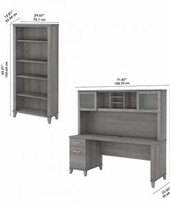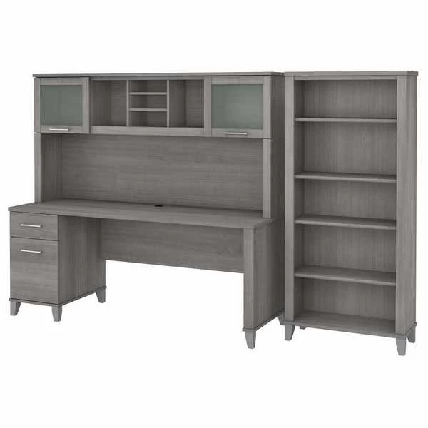 A spacious work surface and plenty of storage capacity make the Bush Furniture Somerset 72W Office Desk with Hutch and 5 Shelf Bookcase a perfect choice for your home office. Spread out with a computer and paperwork while multitasking on an expansive desktop that includes a built-in wire management grommet to keep cords and cables in order. The desk's file drawer opens on full-extension ball bearing slides for easy access to legal and letter size documents while a box drawer keeps the office supplies and utensils you need close by. The Hutch attaches to the desktop and adds a pair of frosted glass doors for concealed storage in addition to open cubby spaces with two shelves for storage of books, binders, decorations and more. The Bookcase features two fixed shelves for stability and three adjustable shelves to accommodate items of various sizes. Somerset's transitional styling includes your choice of several attractive finishes with tapered legs and contemporary metal hardware for an appealing look that works with virtually any decor. The 72W x 24D computer desk can also be used with the coordinating Somerset 42W 3 Position Sit to Stand Return (sold separately) to create an ergonomic height adjustable workspace. This home Office Desk with Drawers and Storage set is tested to meet ANSI/SOHO quality standards for safety and performance.