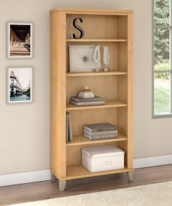 Turn any space into your own personal library with the Bush Furniture Somerset Tall 5 Shelf Bookcase. With a stylish tapered leg design and your choice of several attractive finishes, this tall bookshelf is a perfect way to organize any home office or living room. Two shelves are fixed to provide structural strength, and three are adjustable so your items are sure to fit. The height of the Bookcase matches that of a Somerset Desk and Hutch combination (sold separately) to create a coordinated appearance. Its sturdy construction and durable laminate finish allow you to display books, decorations and more for years to come. Wall attachment hardware is included for family-friendly safety and security. This Tall Bookcase is tested to meet ANSI/SOHO quality standards for safety and performance. Add the 5 tier bookshelf to your existing decor or expand your home office with a broad range of coordinating desk and storage options from the Somerset Collection.