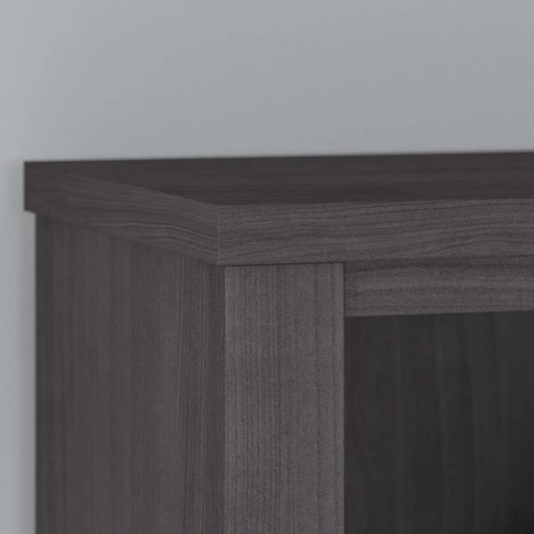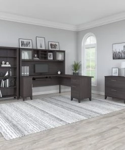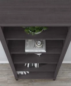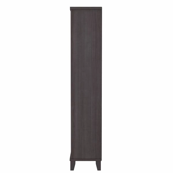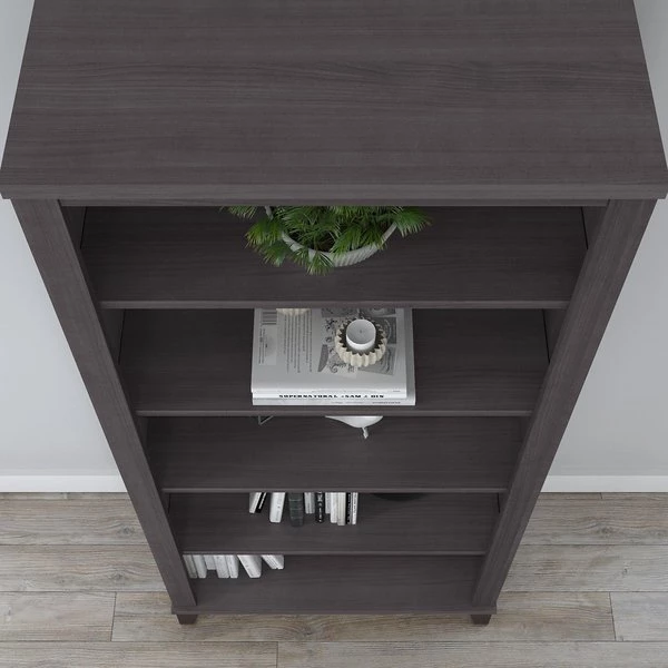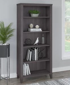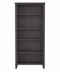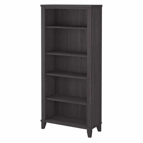 Turn any space into your own personal library with the Bush Furniture Somerset Tall 5 Shelf Bookcase. With a stylish tapered leg design and your choice of several attractive finishes, this tall bookshelf is a perfect way to organize any home office or living room. Two shelves are fixed to provide structural strength, and three are adjustable so your items are sure to fit. The height of the Bookcase matches that of a Somerset Desk and Hutch combination (sold separately) to create a coordinated appearance. Its sturdy construction and durable laminate finish allow you to display books, decorations and more for years to come. Wall attachment hardware is included for family-friendly safety and security. This Tall Bookcase is tested to meet ANSI/SOHO quality standards for safety and performance. Add the 5 tier bookshelf to your existing decor or expand your home office with a broad range of coordinating desk and storage options from the Somerset Collection.