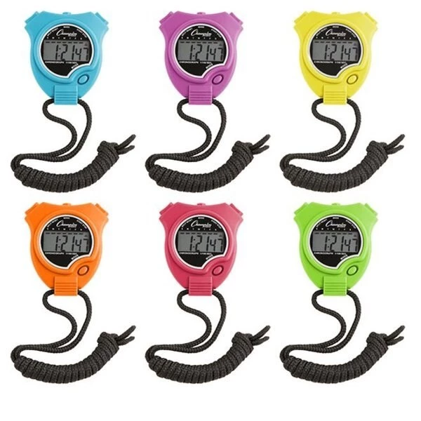 The Champion Sports Stopwatch Neon Set is easy-to-use and packed with multiple features. The large digital display includes 1/100 of a second precision, a lap counter, and 12 or 24 hour formats. Other useful features include calendar and time display, a daily alarm, and an hourly chime. It is also water and shock resistant, so you can train hard without worry. This set of six neon stopwatches comes with one each of neon blue, neon green, neon orange, neon pink, neon purple, and neon yellow.