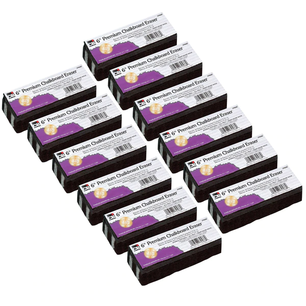 Black and white erasing felts are double lock-stitched to a reinforced backing. Large felt strips provide better cleaning and longevity. 0.13" felt is laminated to the body for additional comfort. Measures 6" x 2" x 1.31". Pack of 12 erasers.