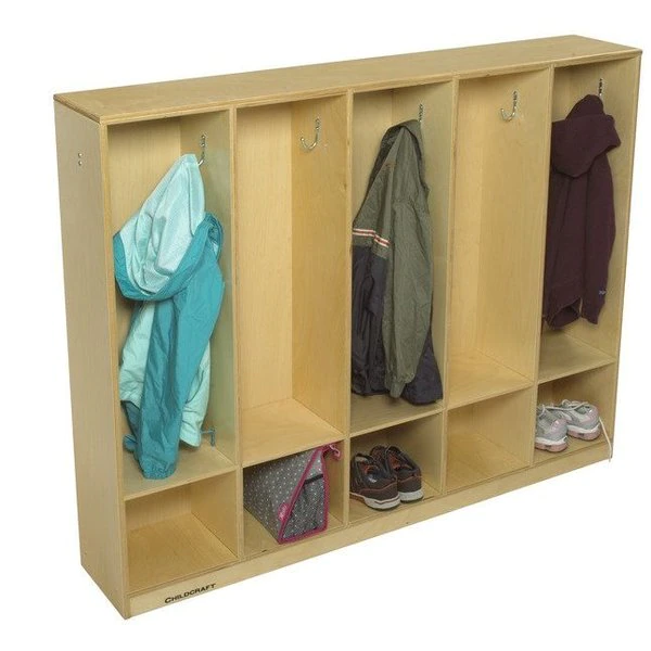Constructed of all birch panels with solid aluminum coat hooks bolted in place. Accommodates up to 10 students. Use alone or add to our 2 or 5 section coat lockers, sold separately. Lower cubbies measure 10 W x 9 D x 8-3/8 H inches and are perfect for storing lunch boxes, shoes, boots, and more. All units have a hardboard back and arrive assembled. For maximum stability, locker must be secured to the wall. New and improved unit includes wood-grain back panel. Complete unit measures 53-3/4 W x 9-5/8 D x 42 H inches and weighs 70 pounds. Crafted in the USA.