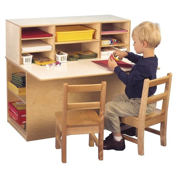 Even the youngest writers will want to practice their creative skills! With plenty of storage and paper space, this unit includes all the features of our larger units, and can accommodate up to two students. Laminate desk top is 21 H inches from the floor. Four removable upper cubby shelves provide extra storage. Simple two bolt assembly required; hardware and instructions included. Measures 36-1/4 W x 29-1/2 D x 32-1/4 H inches. Weighs 84 pounds. Ages 3 to 5. Crafted in the USA.