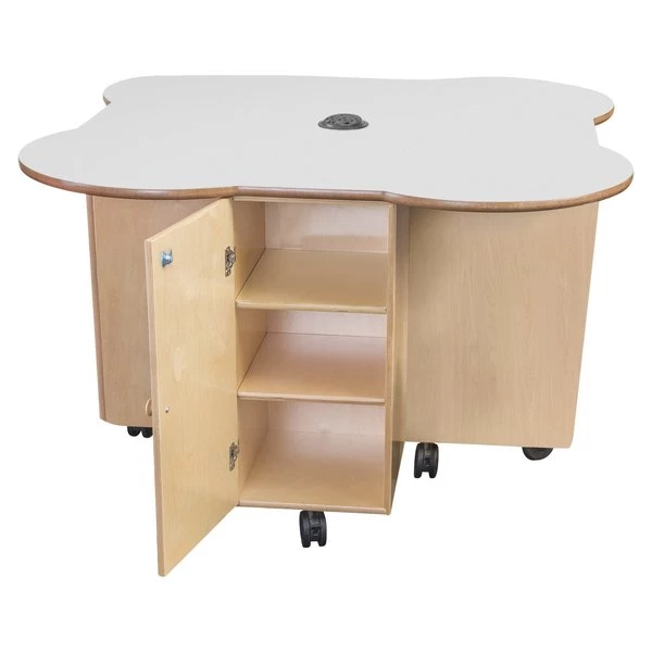 Classroom Select mobile table is designed to support STEAM, STEM, Makerspace, or any learning environment. Each of this unit's 4 compartments features 3 cubby units (two adjustable shelves) and locking doors—providing plenty of space for storing and organizing tools, supplies and more. Wood grained laminate top is durable and cleans easily; whiteboard top also allows students to write on/wipe off with dry erase markers (sold separately). Tabletop grommet features 3 AC outlets, 2 USB ports, and an Ethernet jack. Heavy-duty 3-inch locking casters offer safe and smooth mobility. Full unit measures 47-3/4 x 47-3/4 x 30 H inches. Comes fully assembled. Made in the USA. <em>If you need a smaller size, see the Childcraft® STEAM Table (Item # 1603221)</em>