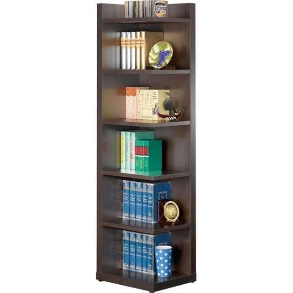 Designed to fit snugly in a corner. this Cappuccino finish bookcase is a casual contemporary storage option. With six shelves for storage and display it is ideal used on its own or you can use multiple units together to create a customized bookcase wall unit. Simple assembly is required.Width (side to side): 19.75" W.Height (bottom to top): 70.75" H.Depth/Length (front to back): 15.75" D.Storage 6 Shelves (Open on One Side):.Shelves and Doors: 6 Shelves.