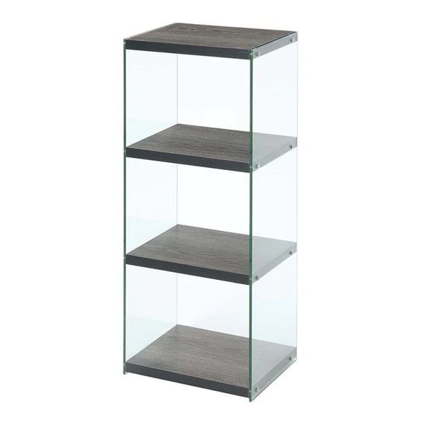 This eye catching SoHo 4 Tier Tower Bookcase by Convenience Concepts is the perfect addition to your home. With a modern contemporary style;; it will bring a stylish touch to your home decor. The tempered clear glass side panels create a magical illusion that the shelves are floating;; making it the perfect stage for your favorite book collection. Providing a total of 4 shelves that enough room for all your collectibles. They are crafted from honeycomb particle board and finished in a rich melamine paper;; making this unit long lasting and easy maintenance. Features a clean lined silhouette and is Multiple finishes. Set up right after with its simple 1 step assembly Pair with additional s from the SoHo Collection by Convenience Concepts. FeaturesPart of the SoHo Collection by Convenience ConceptsFeatures a modern contemporary styleTempered Glass/Honeycomb Particle Board/Melamine PaperEnjoy its simple 1-step assemblyAssembly RequiredSpecificationsColor: Weathered GrayDimension: 15.75 x 12 x 40.75 in.Weight: 44 lbs
