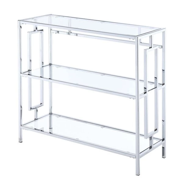 Tired of boring bookcases The Town Square Chrome 3 Tier Bookshelf is the perfect solution. Brimming with glam design. this 3-tier display is ideal to incorporate your favorite books into your decor with style. Books no longer must be stored away from sight. Show them off with pride with this sleek open concept piece. The shelves are made from tempered clear glass. making them both easy maintenance and durable. Constructed from chromed metal. the frame will beat the test of time. With three rectangle shelves. this chic bookcase provides enough space for your favorite trilogies or favorite collectibles. Add to your ensemble right after delivery with its simple 4-step assembly. Look for more furniture pieces from the Tucson Collection by Convenience Concepts. FeaturesStylish glam design to upscale your home decorCrafted from tempered clear glass and chromed metalEnjoy its 4-step assemblySpecificationsColor: Clear Glass & Chrome FrameCollection: Town SquareDimension: 31.5 x 12 x 30 in.Weight: 38 lbs