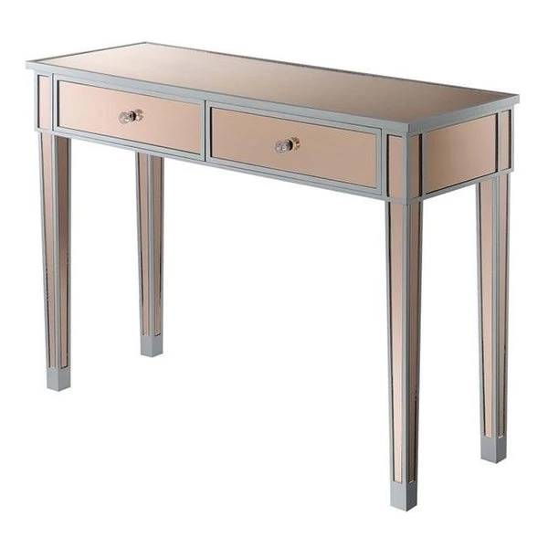 The classy yet contemporary styling of the Gold Coast Mirrored Desk will bring life to any space. The glass mirror inlay pairs perfectly with everything. The faux crystal drawer pulls bring the look together giving you access to the two drawers providing concealed storage. Look for other pieces from the Gold Coast Collection. FeaturesGold Coast CollectionGlass Mirror InlayFaux Crystal Drawer Pulls2 Drawers for Concealed StorageSpecificationsColor: Silver & RoseCollection: Gold CoastWeight: 49 lbs