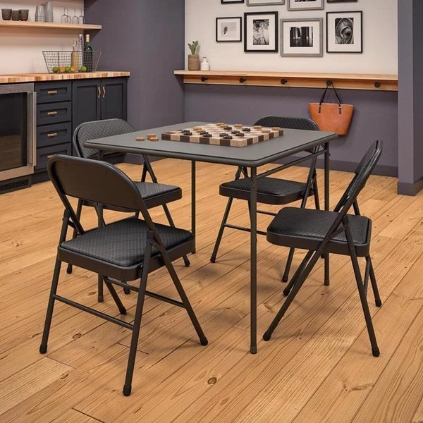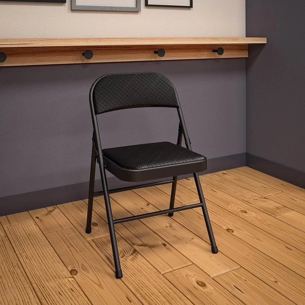 Enhance your next birthday party holiday gathering or daily routine with the Cosco fabric padded seat and back folding chair! The jet black diamond color of this product allows you to have a simple elegant addition to your living space without clashing with your existing color palate or furniture layout while providing extra seating for special occasions or daily use. Constructed out of durable steel and premium fabric this chair guarantees to be a long-term purchase you can use with peace of mind and no regrets! The thick fabric padded seat and back provides you with all-day comfort to ensure long lasting use. The powder-coated finish makes our chair heavy duty while retaining its stylish simplicity. Also featured are non-marring leg tips intended to prevent slipping when in use and protect your floorÆs surface from any possible damage. When not in use the fold hinges built into the chair allow this product to fold flat for easy non-invasive storage so it is out of sight out of mind! Pair this chair with our folding tables and make your next gathering an entertainerÆs dream.