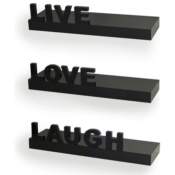 FeaturesWords that inspire make a clear statement on your wall.Create an eclectic display and add a positive focus in your room with this "Live. Love. Laugh" wall mount shelves in espresso finish.Easy to install with no visible connectors or hanging hardware.All hardware included.Color – BlackSet – 3Dimension – 15 x 3.25 x 4.5 in.