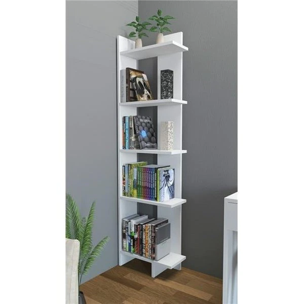 An eye-catching. architectural update on a mid-century modern design. this ladder corner unit bookcase displays your books and decor in artistic style! Crafted of 18mm manufactured wood planks. this bookcase strikes a tall. open silhouette measuring 67" H x 18" W x 9" D overall. Designed to fit right in the corner of your room. this space-saving design includes five shelves for displaying all your novels. framed photos. and collected curios. FeaturesAlice Accent Corner Unit Bookcase18 mm Manufactured woodSpecificationsColor: WhiteCollection: AliceShelf Material: WoodAdjustable Shelving: YesAssembly Required: YesSize: 67" H x 18" W x 9" DWeight: 30 lbs