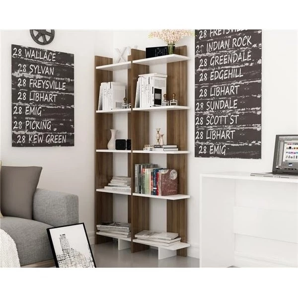 An eye-catching. architectural update on a mid-century modern design. this ladder corner unit bookcase displays your books and decor in artistic style! Crafted of 18mm manufactured wood planks. this bookcase strikes a tall. open silhouette measuring 67" H x 18" W x 9" D overall. Designed to fit right in the corner of your room. this space-saving design includes five shelves for displaying all your novels. framed photos. and collected curios. FeaturesAlice Accent Corner Unit Bookcase18 mm Manufactured woodSpecificationsColor: WalnutCollection: AliceShelf Material: WoodAssembly Required: YesDimension: 67" H x 18" W x 9" DWeight: 30 lbs