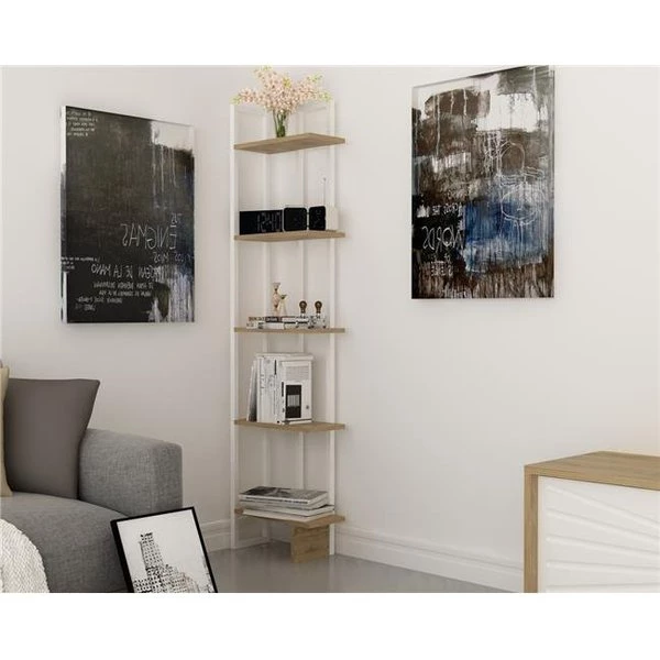 An eye-catching. architectural update on a mid-century modern design. this ladder corner unit bookcase displays your books and decor in artistic style! Crafted of 18 mm manufactured wood planks. this bookcase strikes a tall. open silhouette. Designed to fit right in the corner of your room. this space-saving design includes five shelves for displaying all your novels. framed photos. and collected curios. SpecificationsColor: Oak & WhiteCollection: AliceShelf Material: WoodAssembly Required: YesSize: 71"Weight: 26 lbs