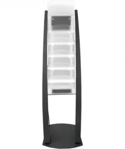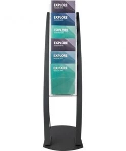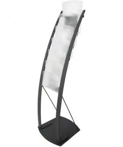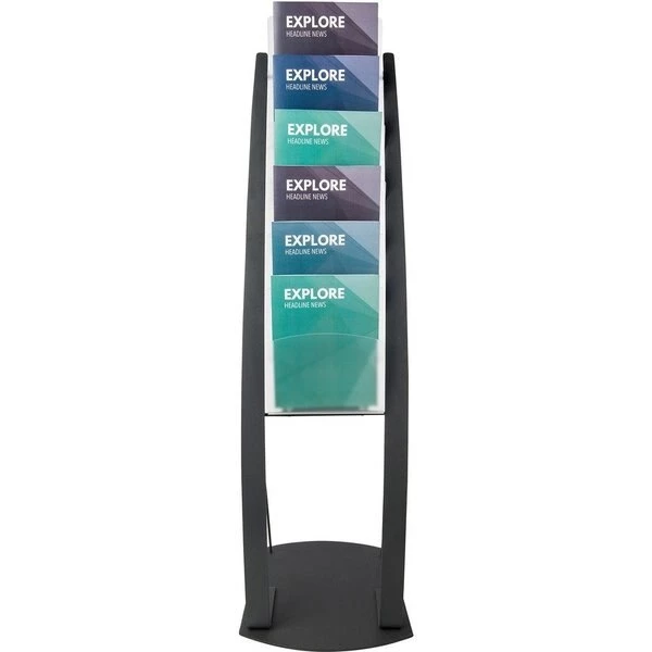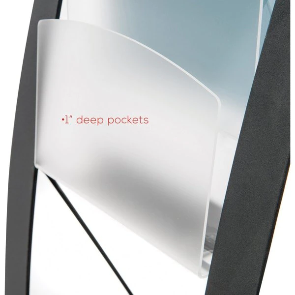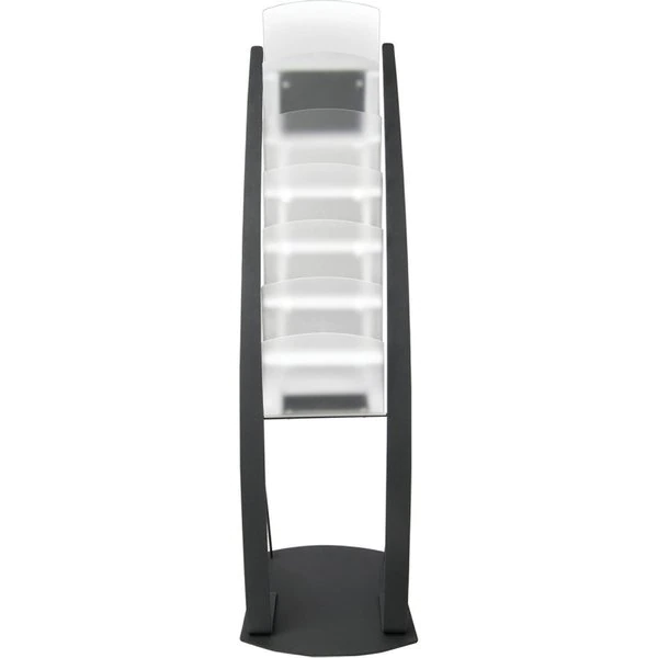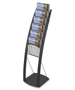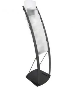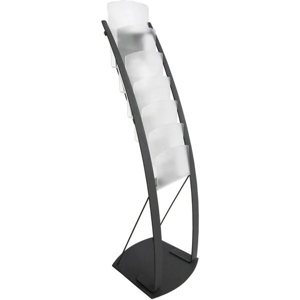 Contemporary floor stand features sleek curves and open design to create an inviting literature display. Six large-capacity compartments accommodate magazine-size materials. Each pocket holds a stack of literature up to 1-1/2" thick. Ideal for reception areas, waiting rooms and trade shows. Frame is made of metal frame. Pockets are made of frosted plastic.