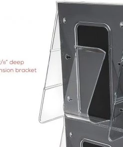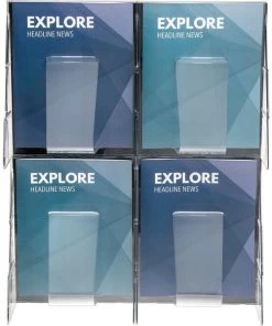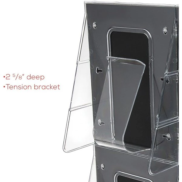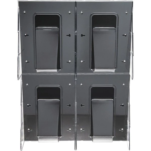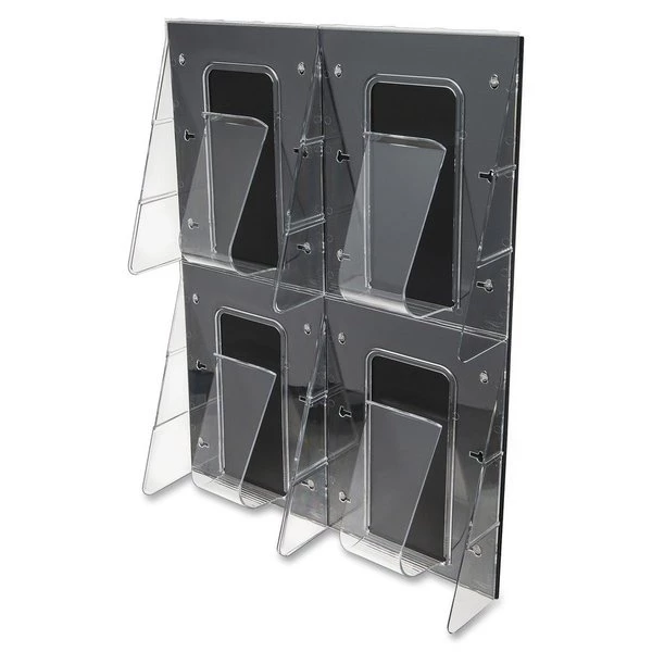 Wall-mountable literature rack offers four magazine-size pockets arranged in two rows for easy access for your visitors. Exclusive, Stand-Tall break-resistant pockets are attached to black plastic panel. High-tension, spring-action bracket keeps literature upright. With a 2-5/8" capacity, each clear pocket holds a large stack of literature. Pre-assembled literature rack includes mounting hardware.
