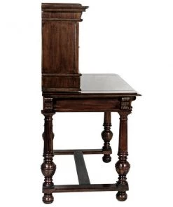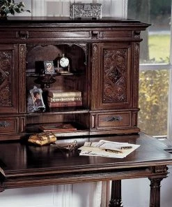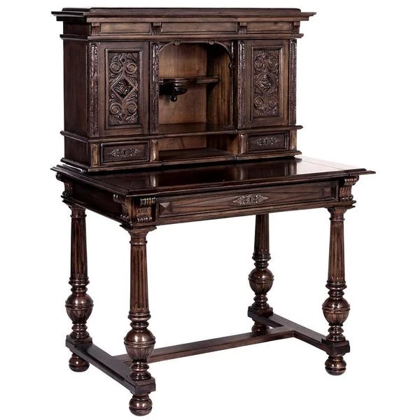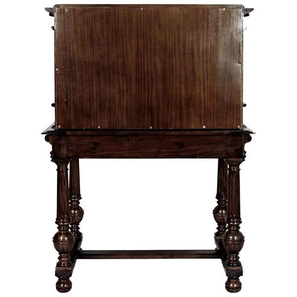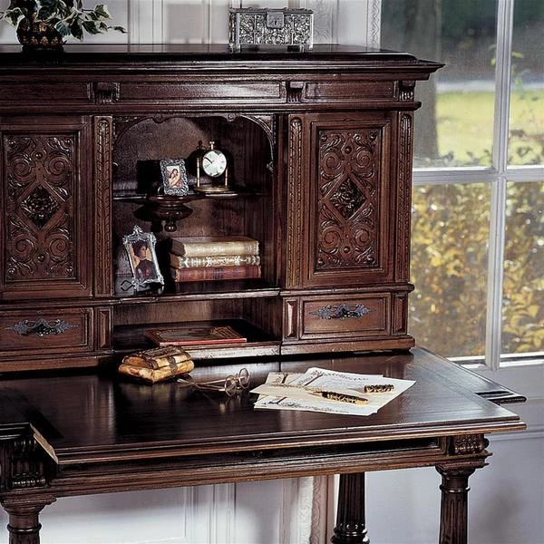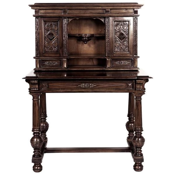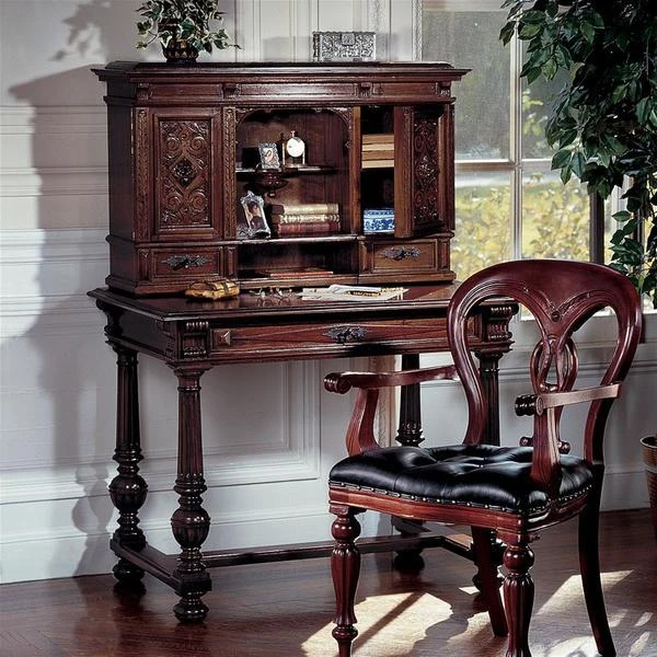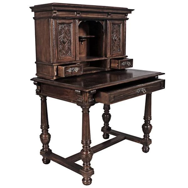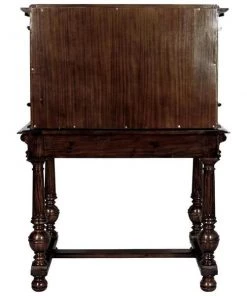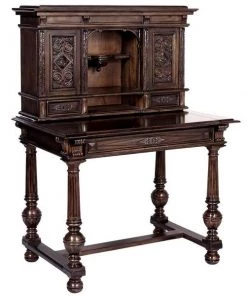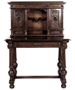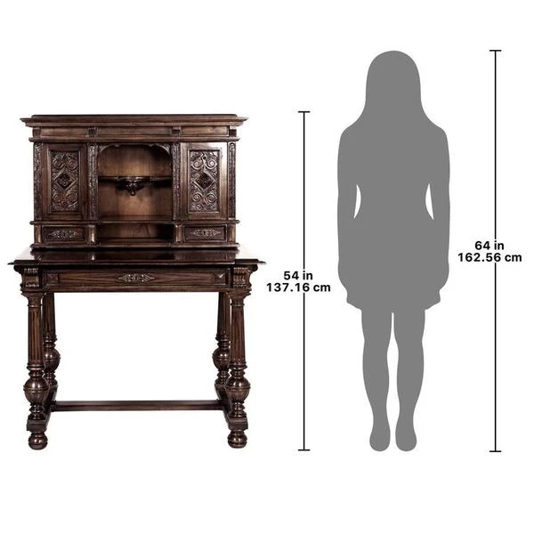 Our early 18th century French antique replica is sized for versatility and boasts a sliding desktop for added writing space. Of hand-carved mahogany, it features two shelved cabinets and drawers for storage, flanking a space for display. Its rich authentic period details take a team to complete this signature piece of furniture art. Ships in 2 pieces. Simple assembly required. 39"Wx26"Dx54"H. 100 lbs.