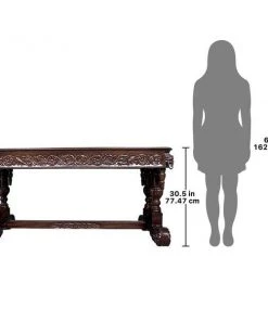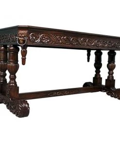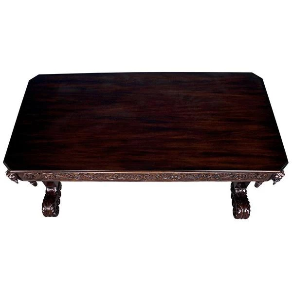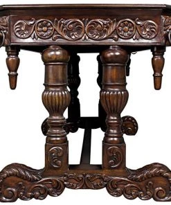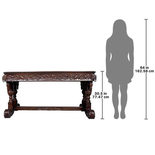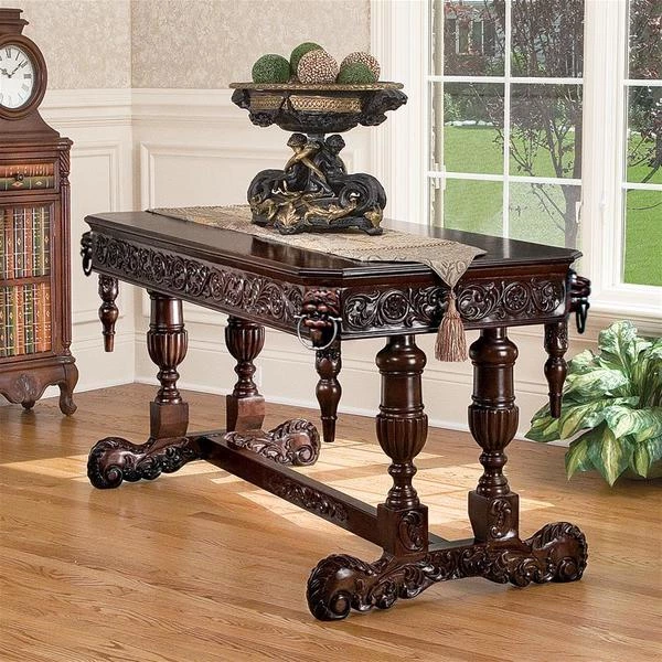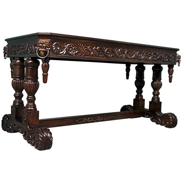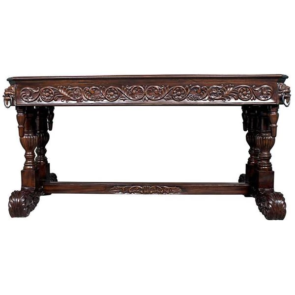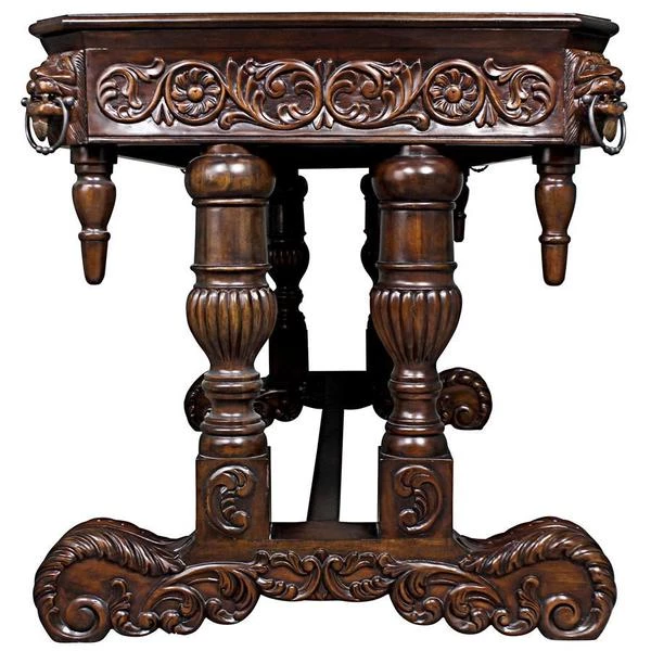 Almost five full feet of ornately hand-carved lions heads with teeth bearing metal rings, acanthus leaves and ornate turnings embellish everything from the balustrade's gadroons to the half-foot wide apron on this Design Toscano signature piece! Whether it serves in the library, entry or office, our solid mahogany desk is stylishly distinctive. Requiring well over a week of skilled hand-carving to create, this grand-scale investment in historic furniture art is a celebration of the decorative architecture of the Renaissance. Simple assembly required. 59"Wx281⁄2"Dx301⁄2"H. 112 lbs.