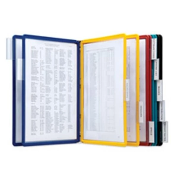 Wall reference system offers glare-free sleeves made of environmentally-friendly polypropylene. Rugged frames come in assorted colors including black. red. dark blue. green and yellow. Metal wall bracket is angled to hold sleeves open. Reference system includes 10 letter-size display sleeves that hold up to 20 documents with snap-on tabs; a metal wall bracket; and mounting hardware.