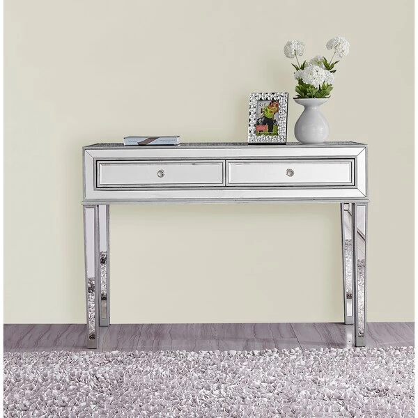 Whether Used As A Dressing Table, A Small Writing Desk, Or As A Console Table, This Contemporary Two Drawer Table Is Stylish, Functional, And Versatile! It Features A Fine Quality Beveled Mirror, Crystal Drawer Knobs, A Hand Painted Silver Finish, And Tapered Legs. Providing Both Utility And Sophistication, The Sleek Lines And Polished Mirror Surfaces Of This Piece Add Distinction And Beauty To Wherever It Used. Features: *Reflexion Collection *Hand Painted Silver Finish *Beveled Mirror Panel *Crystal Drawer Knobs *Solid Wood Trim And Legs *Wood Drawer Glides Product Details: Measurement W42Xd18Xh30” *Minor Assembly Required *Material In Kiln-Dried Solid Wood And Engineered Wood * 1 Year Limited Warranty.