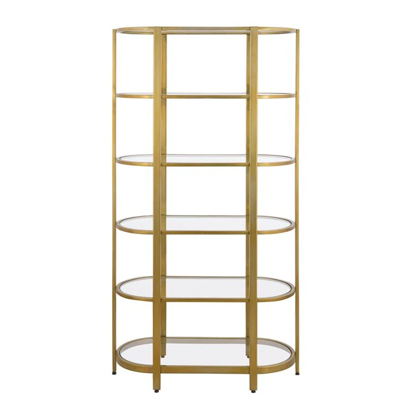 The Blain Bookshelf is a tall etagere-style display shelf with an oval shape and clear tempered glass shelves. The frame is made from a brass tone finished metal. This bookshelf can be used to display books and decorative items, and works in a variety of room styles.
