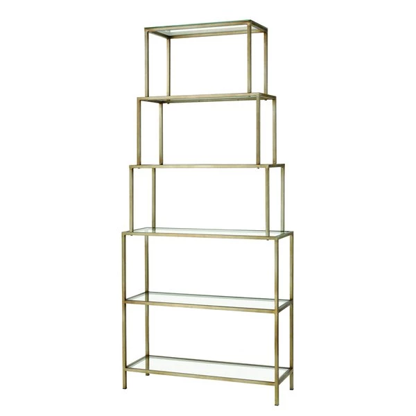 The Louisville Bookshelf is an etagere style shelving unit with glass shelves and a gold metal frame. Upper shelves taper gently, getting smaller as it extends up. This is a chic and versatile piece for a bedroom or living room.