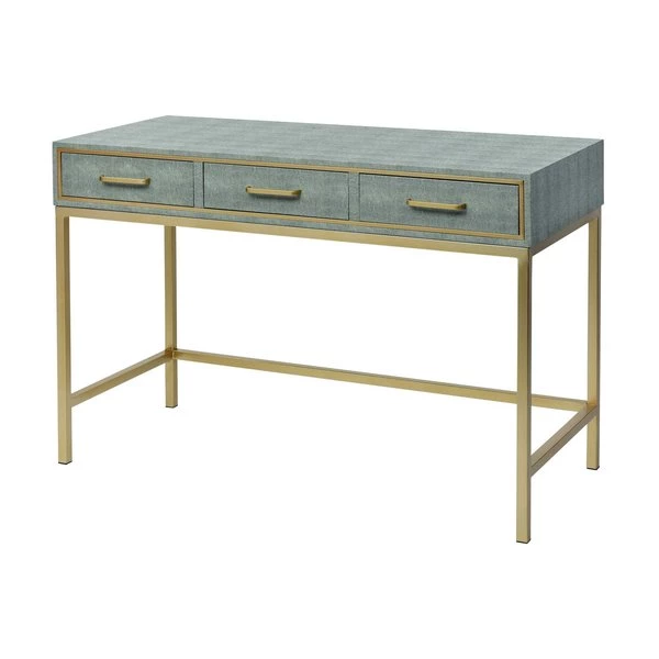 The Sands Point desk has its inspiration set in the early days of book and trunk binding when Shagreen (Ray fish skin) would be used as a hardy and tactile covering. Updating this style, we have chosen to opt for equally hard wearing Faux Shagreen to give this slimline desk its beautiful, white finish. Featuring 3 drawers and accented with a brushed gold frame and handles, this desk is a stylish addition to a modern workspace or living area. Also available in a grey finish. Matching items are available in the Sands Point collection.