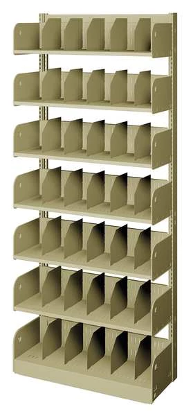 Divider Library Shelving, Single Face Starter, Steel, Color Putty, Finish Powder Coat, Height 84", Width 36", Depth 10", Number of Shelves 7, Shelf Capacity 150 lbs., Shelf Depth 10" Nominal, For Use With Books, Binders, Includes Shelving, (5) Adjustable Dividers per Shelf,Hardware