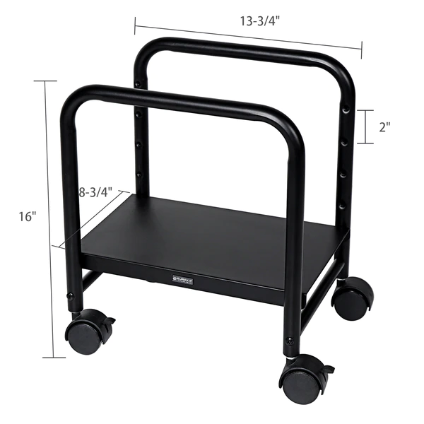 Eureka Ergonomic® Height Adjustable CPU Tower Stand with Locking Wheels, Black, metal. Permitts users to adjust the CPU height in five levels for easier access, without worrying about the length of cables while adjusting the converters. Two swivel casters & two lockable casters provide mobility & stability. Accommodates your machine weighing up to 62.59 lbs. Adjustable height from 5" to 13", supporting area of 14" x 10-6/16".