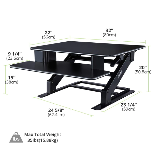 Eureka Ergonomic® Height Adjustable Standing Desk Converter, 32 Inch – Black. Maximum workspace from a compact footprint (24 5/8" W x 23 1/4" D). imply squeeze the handles and let the converter do the work for you, raising your desktop converter to your desired height with very little effort. You will fall in love with the smooth and effortless opperation of this standing desk converter after just one use. Our 32" Sit-Stand Desktop Converter has a usable area equivalent to what you would expect to get from most 36" models. The extra space means that you can support dual monitors on a 32" desktop converter. Don't forget about the second tier! Ours are large enough for a full size keyboard with enough room to work with your mouse comfortably. Our desktop converter will hold up to 35 lbs. and can accommodate up to 2 monitors measuring 30" each when using dual monitor arms and up to 2 x 21" monitors without the monitor arms.