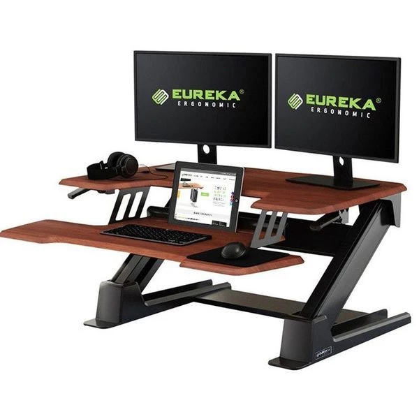 Eureka Ergonomic® Height Adjustable Standing Desk Converter – 36 Inch, Cherry. Simply squeeze the handles and your sit-stand desk converter will smoothly raise up with the help of our patented gas strut mechanism. You'll instantly notice there is very little effort needed to reach your perfect standing height. Silent height adjustment. Top tier can hold up to two monitors. The bottom tier has plenty of space for a laptop, or keyboard. Plus, a special groove has been added for your tablet or smartphone. The top tier has a notch on the back of the desktop converter to attach and center a monitor arm or dual monitor arm. Using monitors is a great way to free up value space on your work surface. No tilting, bouncing, wobbling. Holds up to 35 pounds. Unlike other sit-to-stand desks that are limited to predetermined height settings, the Eureka Ergonomic desktop converters patented gas strut lifting and locking mechanism lets you find your perfect standing height for your correct posture and ergonomic fit. up to 20".