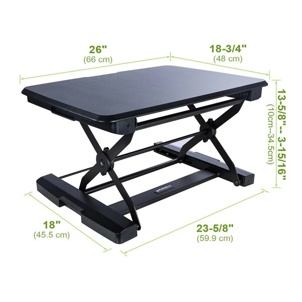 Eureka Ergonomic® Height Adjustable Sit Stand Desk – 26 Inch, Black. A very small desktop footprint. It can fit into most working environments with ease, where space is at a premium. We use a patented gas strut mechanism which is vastly superior to the spring lifting mechanism in other standing desk converters. The gas strut mechanism offers you the most silent experience possible with almost zero noise. imply squeeze the handle and your desk will raise up slightly. With the help of the patented gas strut mechanism, very little effort is needed to reach your desired height. Fit your mobile device into the provided groove plus a mouse, keyboard and other small items on your super-sized keyboard area. There is a rear panel to prevent any of your gear from getting away from you.