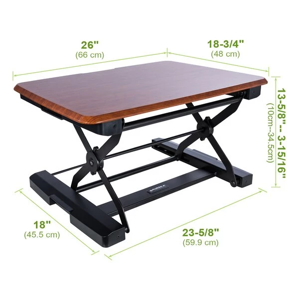 Eureka Ergonomic® Height Adjustable Sit Stand Desk – 26 Inch, Cherry. A very small desktop footprint. It can fit into most working environments with ease, where space is at a premium. We use a patented gas strut mechanism which is vastly superior to the spring lifting mechanism in other standing desk converters. The gas strut mechanism offers you the most silent experience possible with almost zero noise. imply squeeze the handle and your desk will raise up slightly. With the help of the patented gas strut mechanism, very little effort is needed to reach your desired height. Fit your mobile device into the provided groove plus a mouse, keyboard and other small items on your super-sized keyboard area. There is a rear panel to prevent any of your gear from getting away from you.