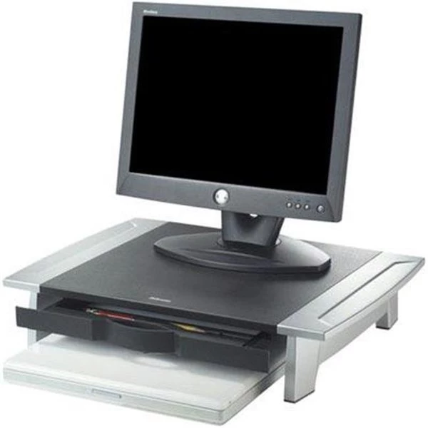MODEL- FEL80311-01 VENDOR- FELLOWES FEATURES- Monitor Riser The Office Suites Monitor Riser places your monitor at a comfortable viewing height to help prevent neck strain! Designed to support up to 80 lbs. and elevate monitor to maximize workspace. Height adjusts up to 2-1/2" (between 4" and 6-1/2") for optimal viewing angle. Stow your laptop underneath for in-office use and extra desktop space. Storage tray organizes business essentials for easy access. Non-skid rubber feet protects work surface from scratches or scuffs.* Dimensions: 19.875"w x 4.1875"h x 14.0625"d MANUFACTURER WARRANTY:;;1 YEAR
