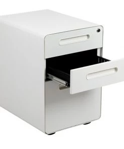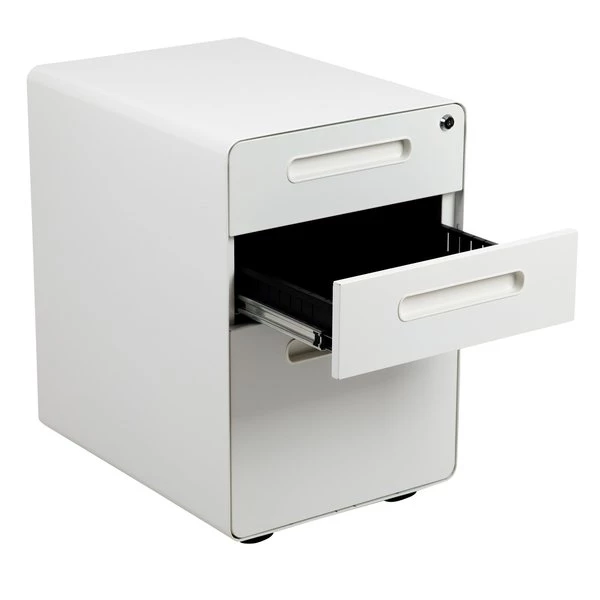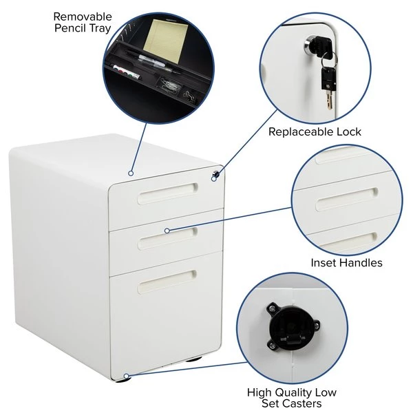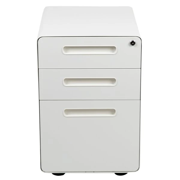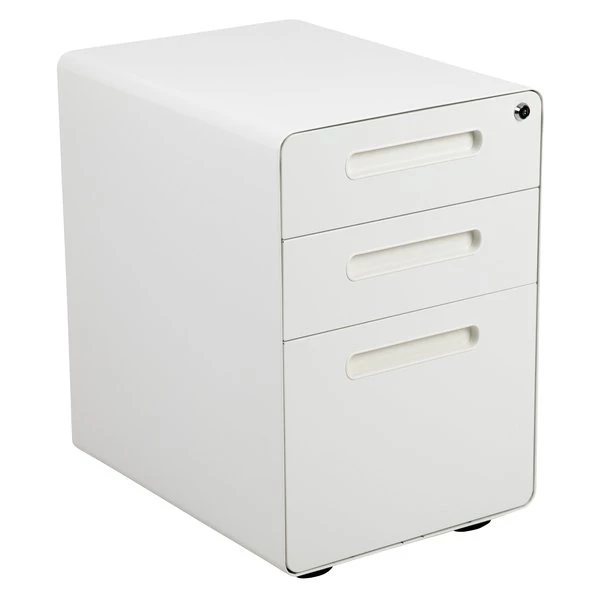 You may love your current desk but have nowhere to store your paperwork without cluttering the desktop, insert this locking file cabinet to keep the minimalistic appearance of your modern office desk. This 3-drawer pedestal file cabinet has low set casters to keep up with the needs of a busy worker. The convenience of casters is ideal for employees who regularly file documents, allowing them the option to pull the cabinet near them while monitoring incoming emails. The modern 3-drawer mobile file cabinet has two utility drawers to hold your small office supplies, snacks, vitamins and writing utensils while the hanging file drawer holds A4, letter, legal, and F4 hanging folders. An included pencil tray keeps your small supplies neatly stored and can be used in either of the two utility drawers. Two keys are included to keep in separate locations or as a duplicate for your assistant. Inset drawer handles provide a modern appearance and a worry-free solution to loosening handle screws. Organize your office space with this mobile under desk filing cabinet that comes fully assembled and ready-to-use. This ergonomic filing cabinet is a smart solution for any workplace whether used for heavy-duty daily filing or the casual user.