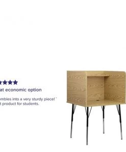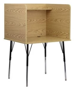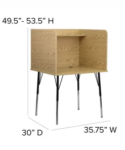 Furnish your library, commercial testing center, or computer lab with this modular study carrel for flexible study spaces to provide a quiet, private study or work area for everyone from children to adults. Whether you're studying for an upcoming exam or need a quiet space to read, this adjustable study carrel can be used in a variety of environments. The smooth laminate top boasts an oak finish and is spacious enough to accommodate a laptop or flat screen monitor while the upper shelf can hold books or other supplies to free up additional work space. The adjustable height legs move 4 inches up or down in 1" increments making this floor carrel ideal for all grade levels from elementary to high school. Keep cords out of the way and organized with the wire management grommet. Self-leveling glides will give you a stable, level surface to complete your tasks. The solitude of a study carrel is perfect for any environment where individual concentration is required.