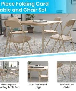Host all those upcoming events with ease when you have this . This set is a convenient solution for times when you have more guests than table settings. This folding card table is the perfect size for card and board games to get the family involved or to host game night. The 5 piece set includes 4 metal padded folding chairs and a square folding table. The table top is padded to help slow down thrown cards from sliding off the table. Powder coating protects the legs from scratches while plastic floor glides protect your floor by sliding smoothly.This classic set comes in handy when you need additional table settings for family get-togethers or for poker night in the man cave. It can be used indoors or outside and is lightweight and easy to fold up, transport and store.