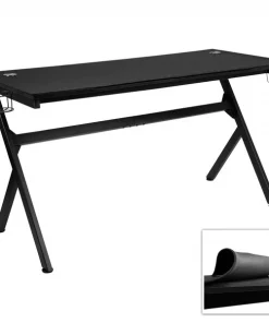 Whether you're on a quest, building cities from the ground up or taking out zombies a great gaming desk is a must have. This black gamer workstation features a headphone holder and cupholder to free up your hands and 2 cable management holes to keep you organized. This extra large computer table is specifically designed to hold your gear and has space for your gaming console and controllers, laptop and other necessities such as dual monitors, a keyboard and a gaming mouse. This contemporary home computer desk has a removable padded top so the whole surface acts as a mouse pad. The ultra strong powder coated steel frame holds up to 110 lbs weight capacity. This computer desk for gaming gives you generous leg room and ample space for a desktop tower or a 6 can mini-fridge for those marathon gaming sessions. Self-leveling floor glides will ensure your platform stays stable. This gaming station desk assembles in less than 30 minutes with the included tools. A premium home office PC table is great for all gamers and will be right at home in your home office, bedroom, dorm room, or gaming room. Pair this gaming desk with one of our gaming racing office ergonomic computer PC adjustable swivel chairs for the ultimate experience.