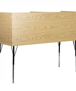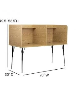 Furnish your library, commercial testing center, or computer lab with this modular double study carrel for flexible study spaces to provide a quiet, private study or work area for everyone from children to adults. Whether you're studying for an upcoming exam or need a quiet space to read, this adjustable study carrel can be used in a variety of environments. The smooth laminate top boasts an oak finish and is spacious enough to accommodate a laptop or flat screen monitor while the upper shelf can hold books or other supplies to free up additional work space. The adjustable height legs move 4 inches up or down in 1" increments making this floor carrel ideal for all grade levels from elementary to high school. Keep cords out of the way and organized with the wire management grommets in each carrel. Self-leveling glides will give you a stable, level surface to complete your tasks. The solitude of a study carrel is perfect for any environment where individual concentration is required.