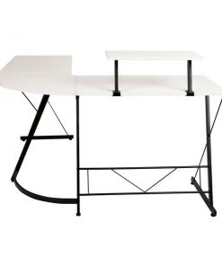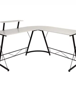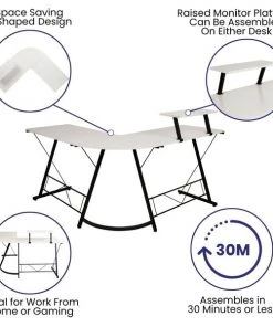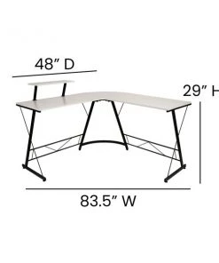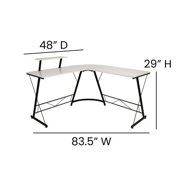 Today's challenges have more people working from home than ever before so a great workstation is essential for your home office. This full L-shaped corner desk can handle anything your workday throws at it. The corner hugging design takes away the need for lots of floor space saving you priceless real estate in your living room, bedroom or den. The corner connector will easily accommodate dual monitors leaving plenty of surface space for writing reports, analyzing data or getting major projects finished up on time. Featuring a raised monitor stand that can be attached on either side of the desk, this home office computer desk allows you to have several monitors so you can host virtual meetings and still keep necessary spreadsheets open for your perusal. All work and no play is never any fun so when you're ready to kick back and relax this gaming station desk has you covered. Add wide monitors or TV screens for a full gaming experience. The spacious work surface has more than enough room for your gaming console and controllers, laptop and other necessities. Place your custom gaming PC under the desk and still have plenty of legroom to stretch out during marathon sessions. This contemporary home computer desk has a white textured top that sits atop an open black powder coated frame that holds up to 175 lbs. Place this corner computer gaming desk on either corner of a room or if space isn't an issue, come off the wall to add an open concept feel and dual side access. Self-leveling floor glides will ensure your platform stays stable. Quick assembly, easy cleaning and great versatility make this home computer desk an ideal choice for your home office, teen's bedroom or family room.