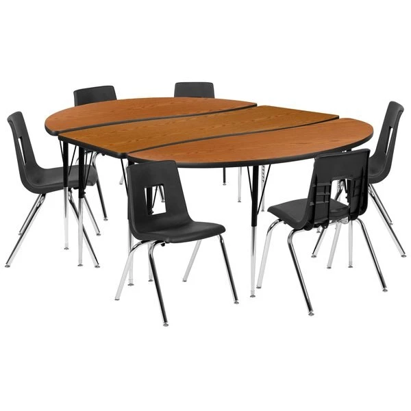 Prepare for a new year by incorporating these modern flexible learning table sets in your classroom that are designed to encourage all students to participate in group learning. You can create unlimited combinations using various shapes and colors. With our ergonomic shell student chairs included there is no need to shop around. Practical for any class setting this school table group will last you for many years with its durable thermal fused laminate top that is scratch, stain and warp resistant. Height adjustable chrome lower legs give you the flexibility to raise or lower the table. Self-leveling nylon floor glides keep the table from wobbling and protect your floor by sliding smoothly when you need to move it. Purchase our pre-built table and chair bundle for your classroom, home, rec center, or other public gathering facilities. The plastic stack chairs with 18" seat height are ideal for middle, high school and college students. You can create a flexible learning workspace out of your conference room to grow work relationships by having teams meet regularly in a group setting.