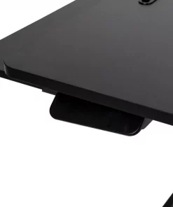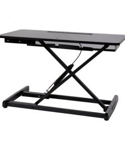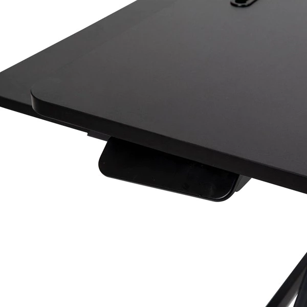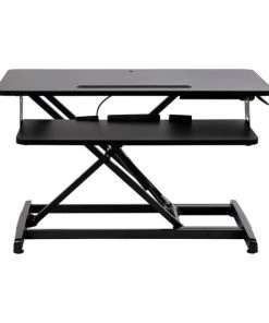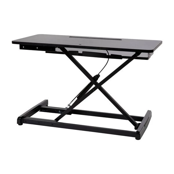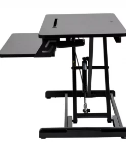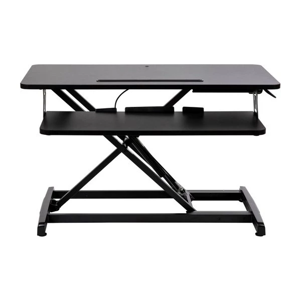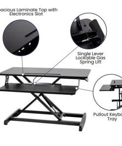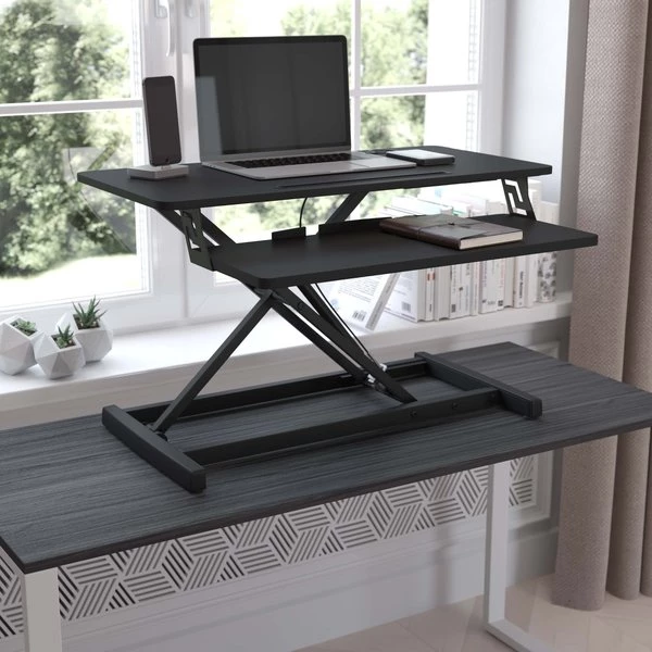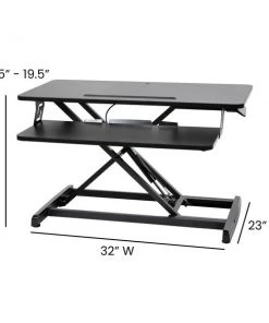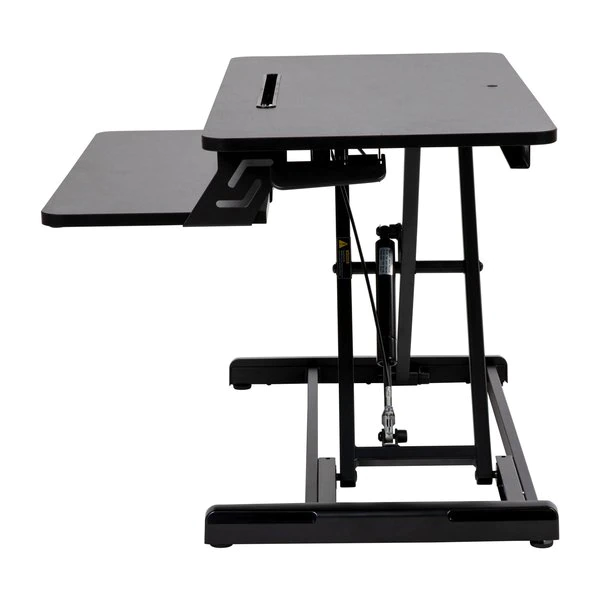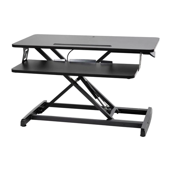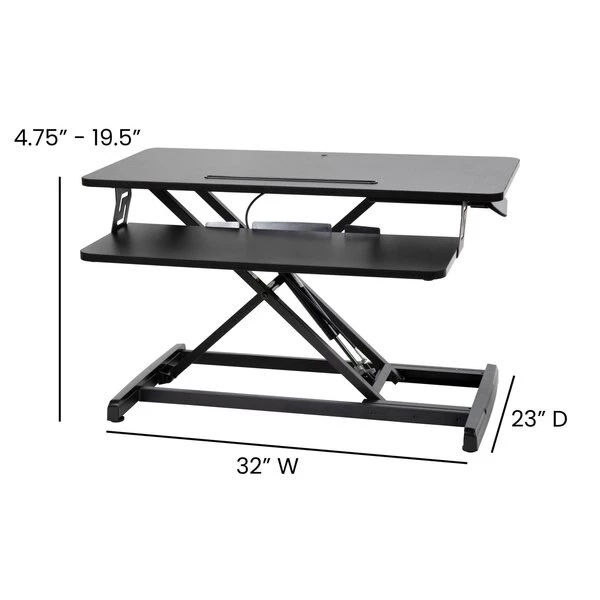 Take a break from the everyday and gain some health benefits with this adjustable height desk riser. Going from a seated position to standing gets the body moving to help burn calories, improve mental focus and boost productivity. The generous work surface of this 32 inch sit to stand desk riser holds up to 28 pounds and will accommodate everything from a laptop to a dual monitor desktop setup. The built-in desktop slot has multiple uses including holding your tablet or phone. Sitting for long periods is becoming more common as the workday grows longer. This adjustable desk riser adapts from 4.75" to 19.5" with a single lever giving you the option to sit or stand depending on the task at hand. Standing helps strengthen leg muscles, improves your balance and promotes healthy blood flow. A lockable gas spring allows you to stop the ascent or descent of the desk at any time while the pullout keyboard tray keeps a staggered height between the keyboard and monitor. Never worry about the surface of your traditional desktop, nonskid rubber pads protect your desk's surface and prohibit the unit from sliding. Have your new adjustable riser ready to go in under 10 minutes with the illustrated instructions. Use a dry cloth to keep your convertible desk riser looking good as new.