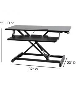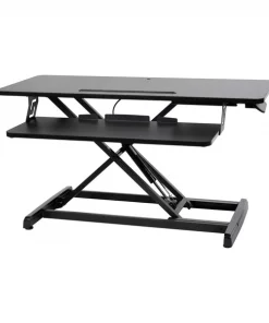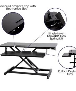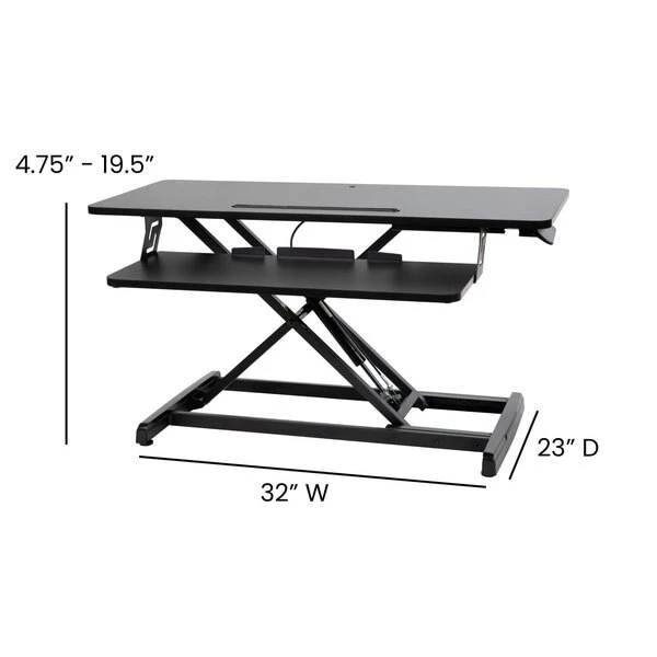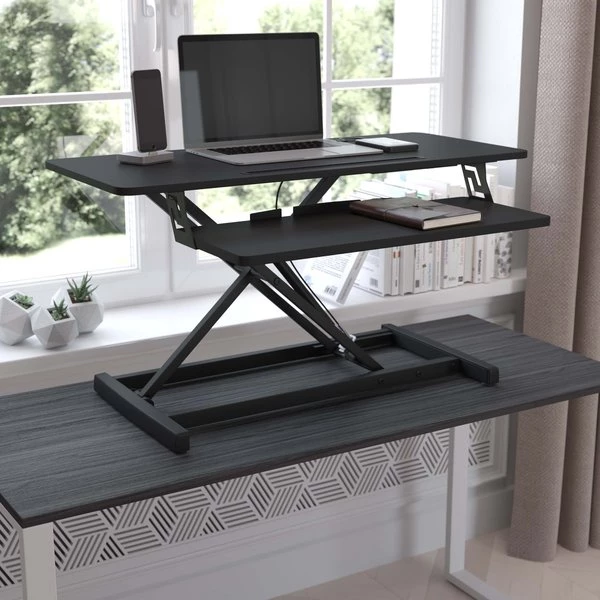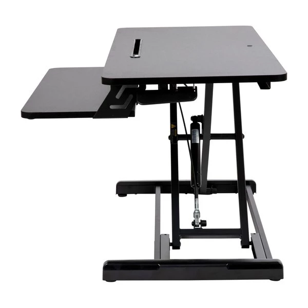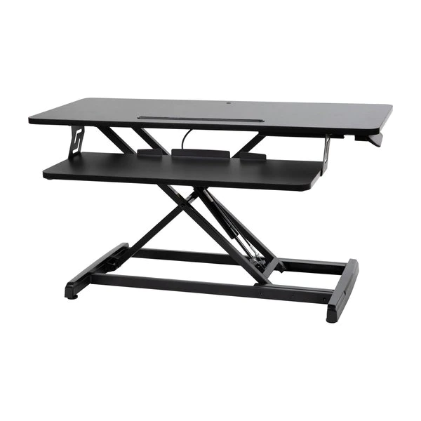 Take a break from the everyday and gain some health benefits with this adjustable height desk riser. Going from a seated position to standing gets the body moving to help burn calories, improve mental focus and boost productivity. The generous work surface of this 36 inch sit to stand desk riser holds up to 28 pounds and will accommodate everything from a laptop to a dual monitor desktop setup. The built-in desktop slot has multiple uses including holding your tablet or phone. Sitting for long periods is becoming more common as the workday grows longer. This adjustable desk riser adapts from 4.75" to 19.5" with a single lever giving you the option to sit or stand depending on the task at hand. Standing helps strengthen leg muscles, improves your balance and promotes healthy blood flow. A lockable gas spring allows you to stop the ascent or descent of the desk at any time while the pullout keyboard tray keeps a staggered height between the keyboard and monitor. Never worry about the surface of your traditional desktop, nonskid rubber pads protect your desk's surface and prohibit the unit from sliding. Have your new adjustable riser ready to go in under 10 minutes with the illustrated instructions. Use a dry cloth to keep your convertible desk riser looking good as new.